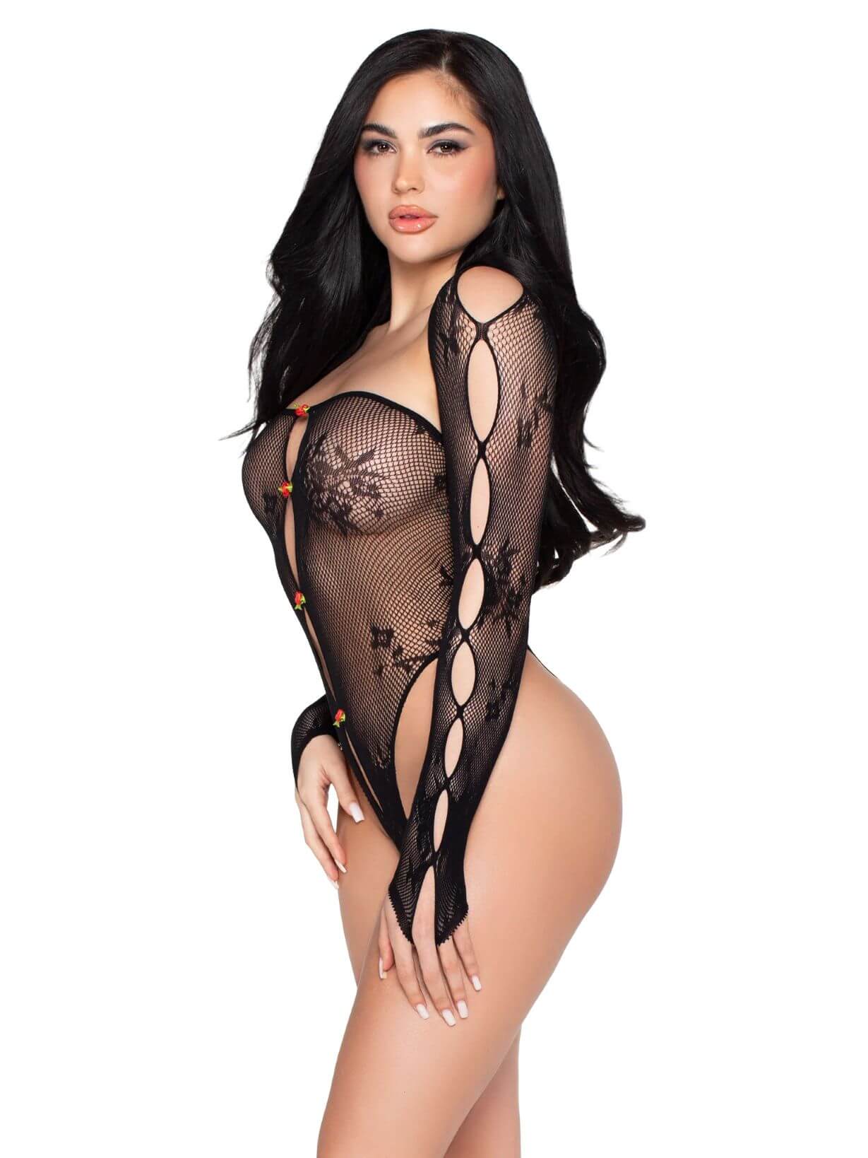 Un modello che unisce carattere, eleganza e un gioco di trasparenze estremamente raffinato. Il body a rete con inserti in pizzo mette in risalto la silhouette grazie alle aperture a goccia lungo il davanti e le maniche. Le piccole rosette decorative aggiungono un tocco romantico che rende il completo ancora più particolare.