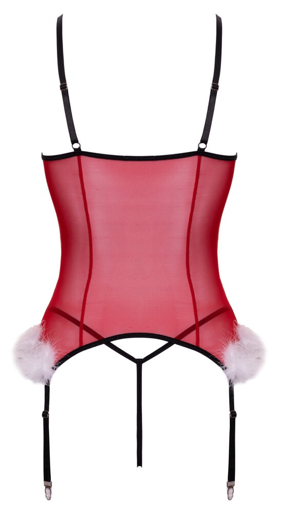 Le coppe in pizzo valorizzano il décolleté, mentre il cinturino decorativo frontale slancia la linea del busto. La rete elastica si adatta con naturalezza alle forme, offrendo una sensazione di leggerezza perfetta per le serate delle feste. Il perizoma in pizzo completa l’insieme, creando un look natalizio armonioso e curato nei dettagli.