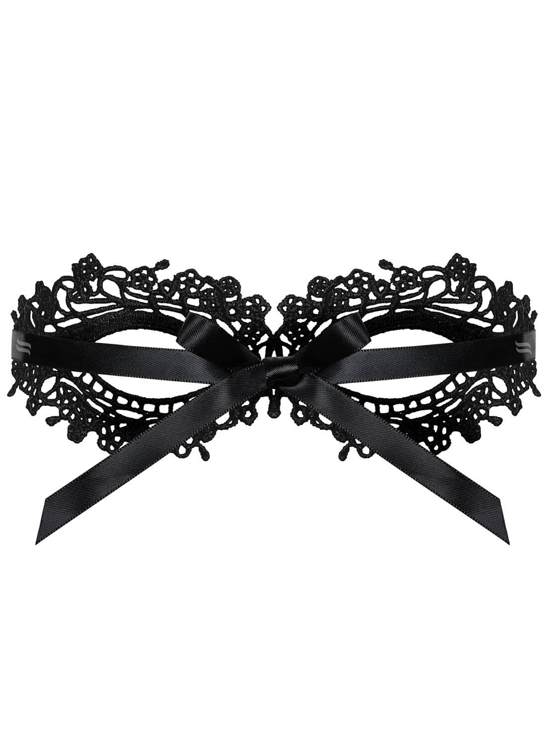 Elegantissima mascherina nera in pizzo, effetto pizzo di Cantù, con nastro da allacciare manualmente dietro la testa.