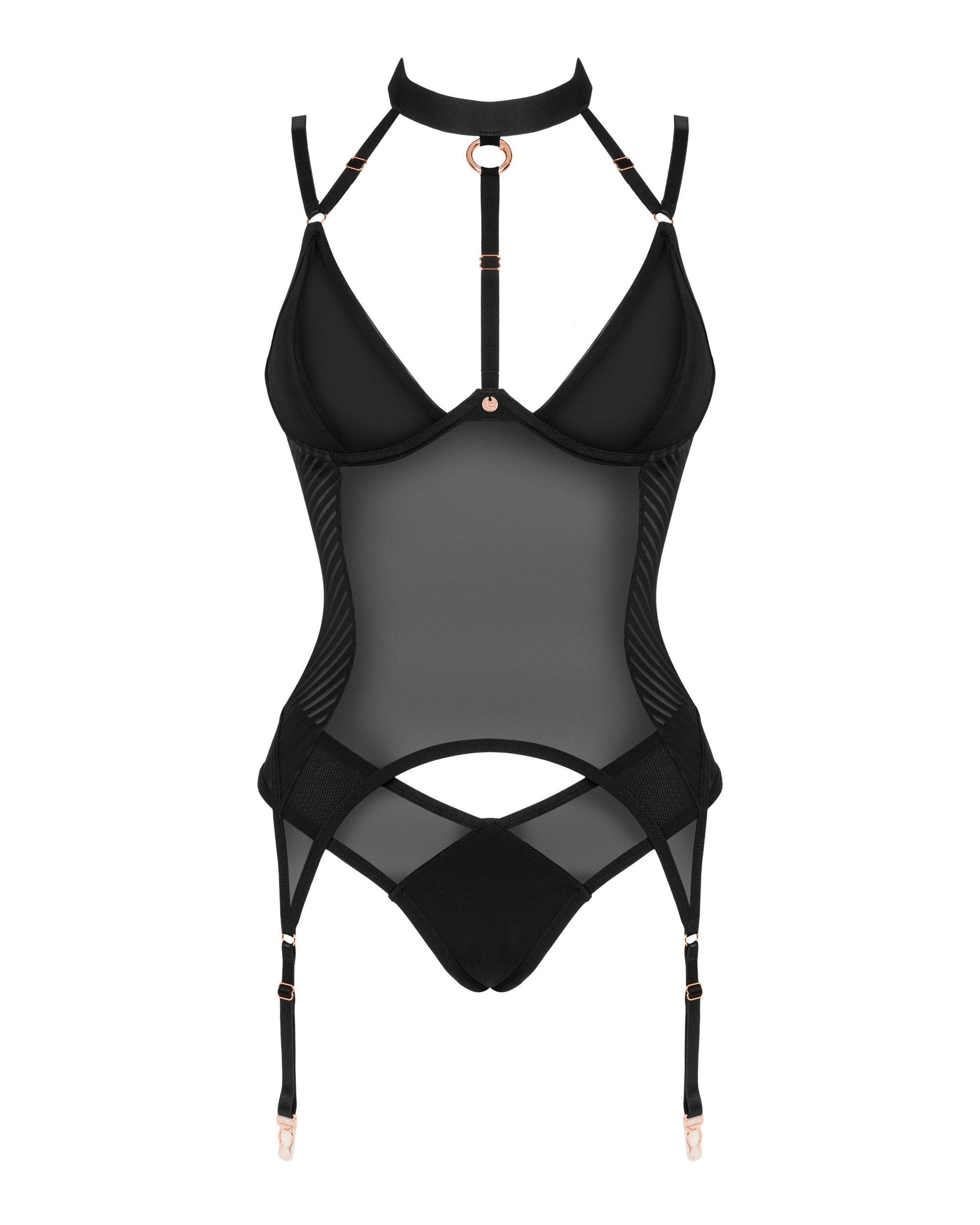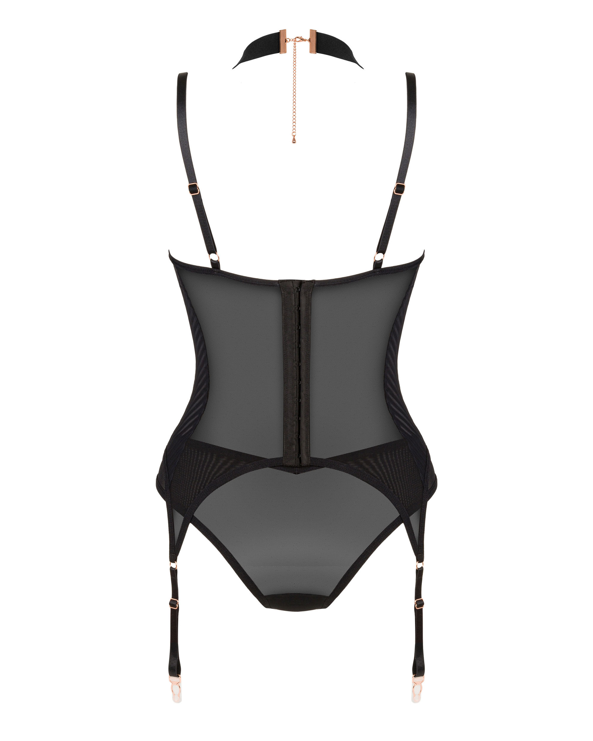 Ecco a te il corsetto Brasica con girocollo integrato, stringhe reggicalze e mutandine in pendant.