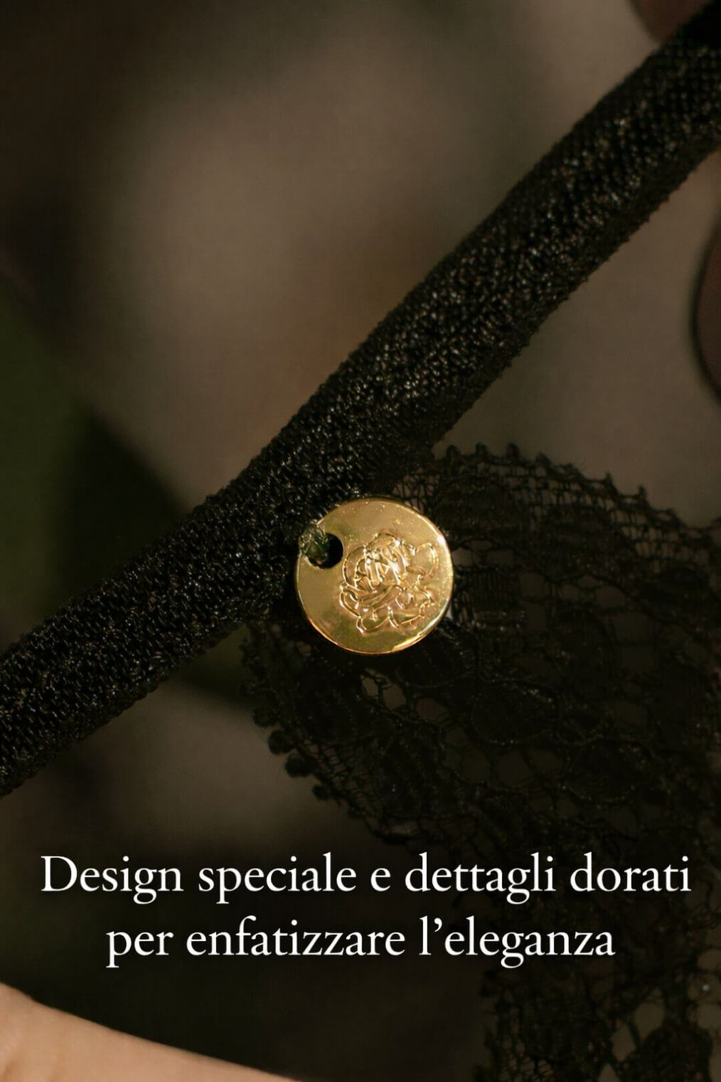 Le fasce regolabili con dettagli dorati permettono di adattare la vestibilità in modo preciso, mantenendo leggerezza e comfort. Il reggicalze integrato aggiunge un elemento distintivo, pensato per completare l’intimo con eleganza e coerenza stilistica.