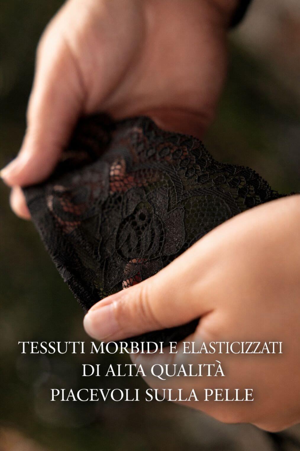 Un capo intimo che gioca sul contrasto tra delicatezza dei materiali e linee più decise, mantenendo comfort e qualità costruttiva.
