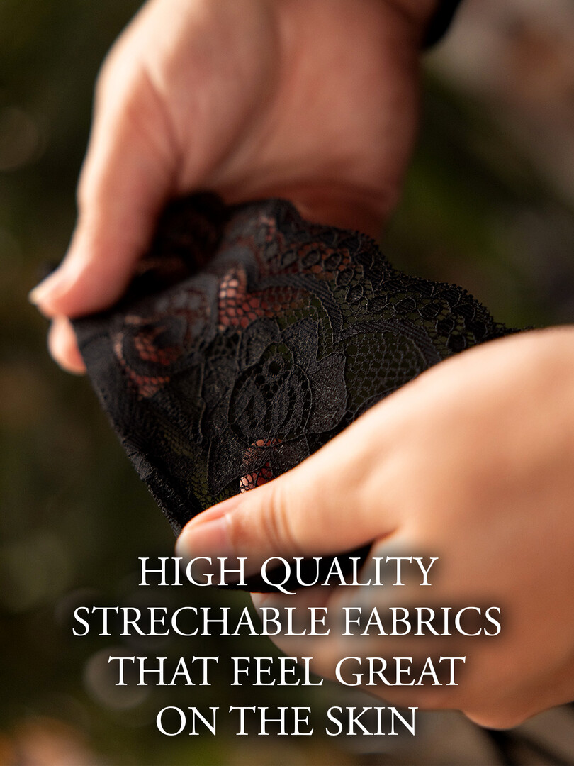 Il perizoma Claire di Le Désir è realizzato in pizzo elasticizzato nero, leggero e raffinato, arricchito da discreti dettagli color oro. Le trasparenze sono curate e bilanciate, per un risultato elegante e femminile.