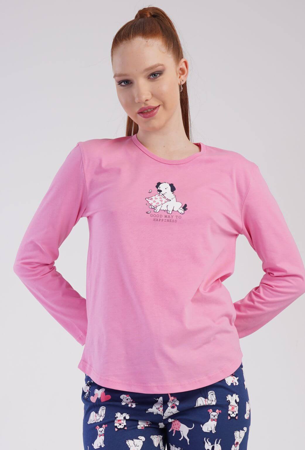 Un pigiama allegro e confortevole, perfetto per aggiungere un tocco di dolcezza alle tue serate. La maglia rosa a maniche lunghe è decorata con una simpatica stampa di un cagnolino bianco, mentre i pantaloni blu sono animati da un vivace motivo con diversi cani e dettagli colorati.