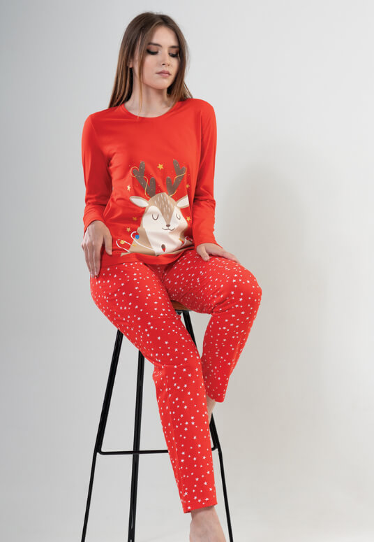 Il pigiama perfetto per vivere l’atmosfera delle feste con un tocco di dolcezza e colore. Questo completo da donna in 100% cotone è composto da una maglia a manica lunga rossa con adorabile stampa di una renna e pantaloni coordinati decorati con tante stelline bianche.