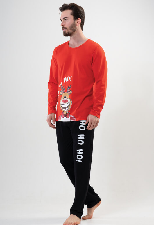 Un pigiama allegro e confortevole, perfetto per vivere lo spirito natalizio con ironia. Realizzato in 100% cotone, questo completo da uomo è composto da una maglia rossa con stampa di una renna sorridente e pantaloni neri con la scritta “Ho Ho Ho” stampata lungo la gamba.