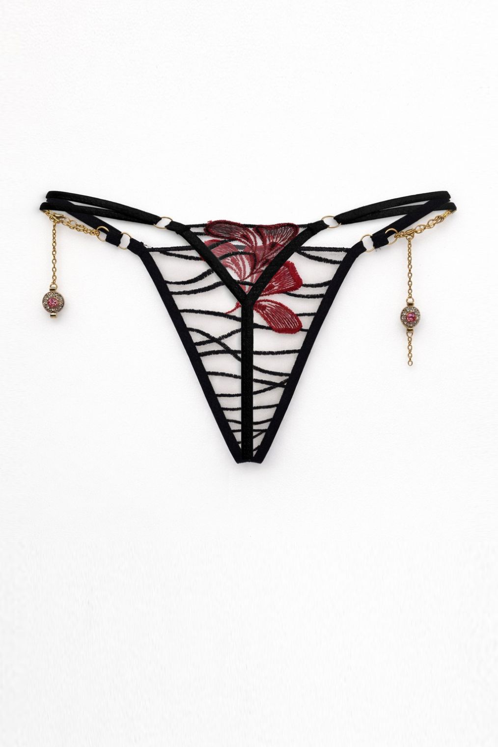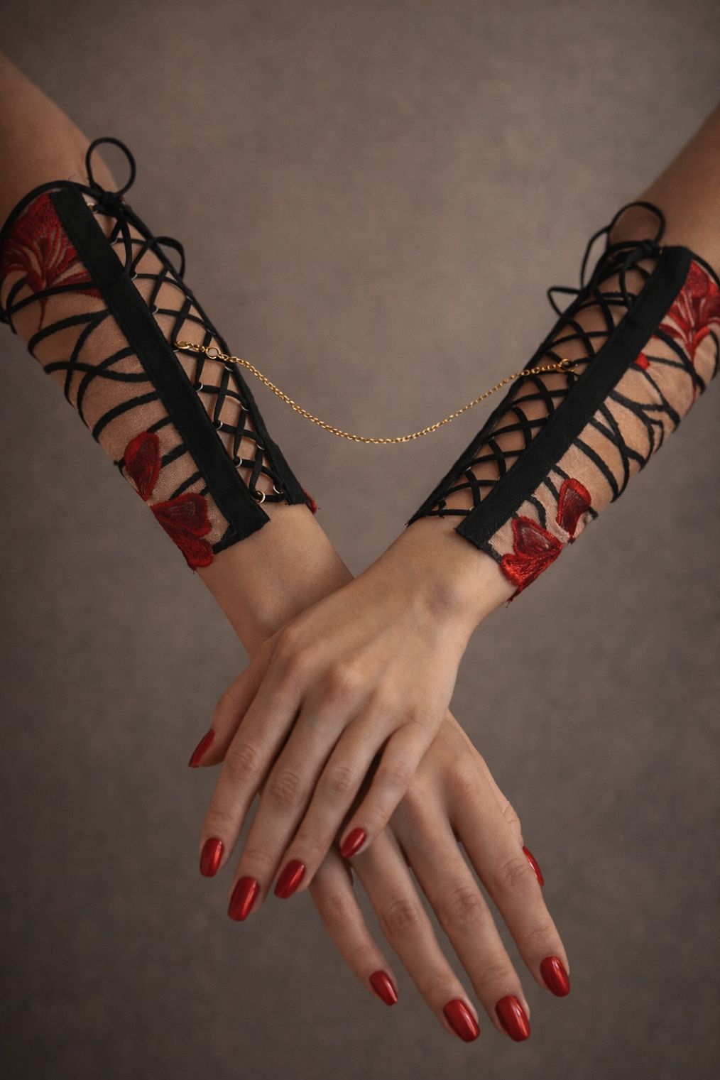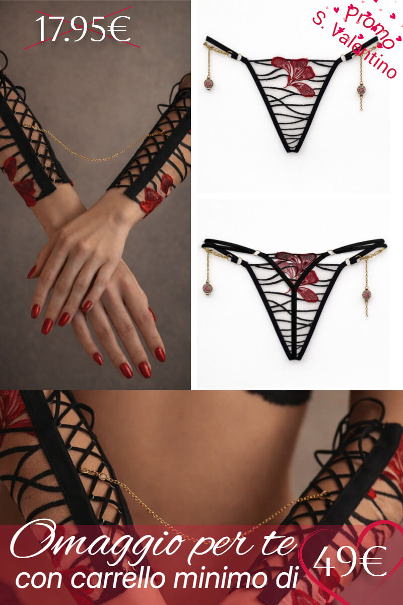 Questo esclusivo set composto da polsini stringati e perizoma è perfetto per chi ama stupire con eleganza. I polsini, che si estendono dal polso al gomito, sono decorati con laccetti a incrocio e ricami floreali in nero e rosso, collegati tra loro da una delicata catena argentata. Il perizoma, arricchito da anelli gioiello e catene, completa il look sensuale. Ogni dettaglio di questo capo è pensato per esaltare la tua femminilità.