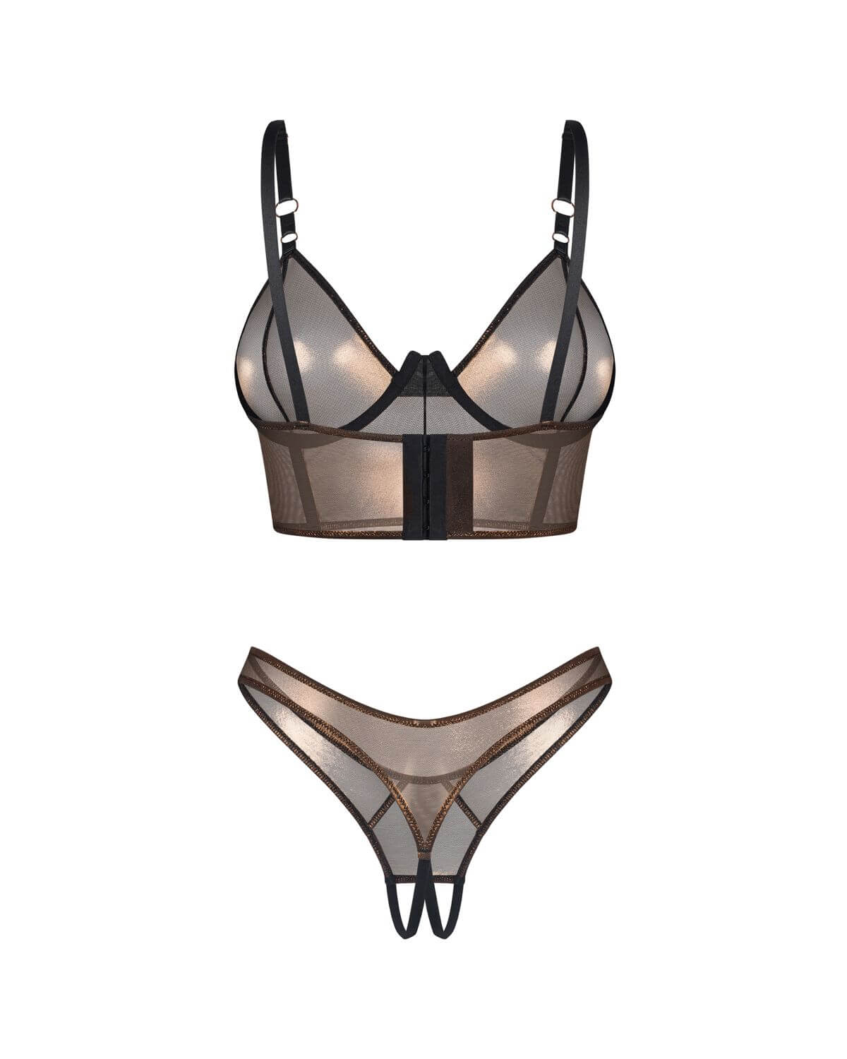 Il set Soranna di Obsessive esalta la silhouette con la sua rete dorata trasparente e la lucentezza del tessuto che gioca con la luce in modo raffinato. Il top con ferretto offre un sostegno leggero e una forma definita, mentre il perizoma aperto aggiunge un tocco audace e irresistibile.