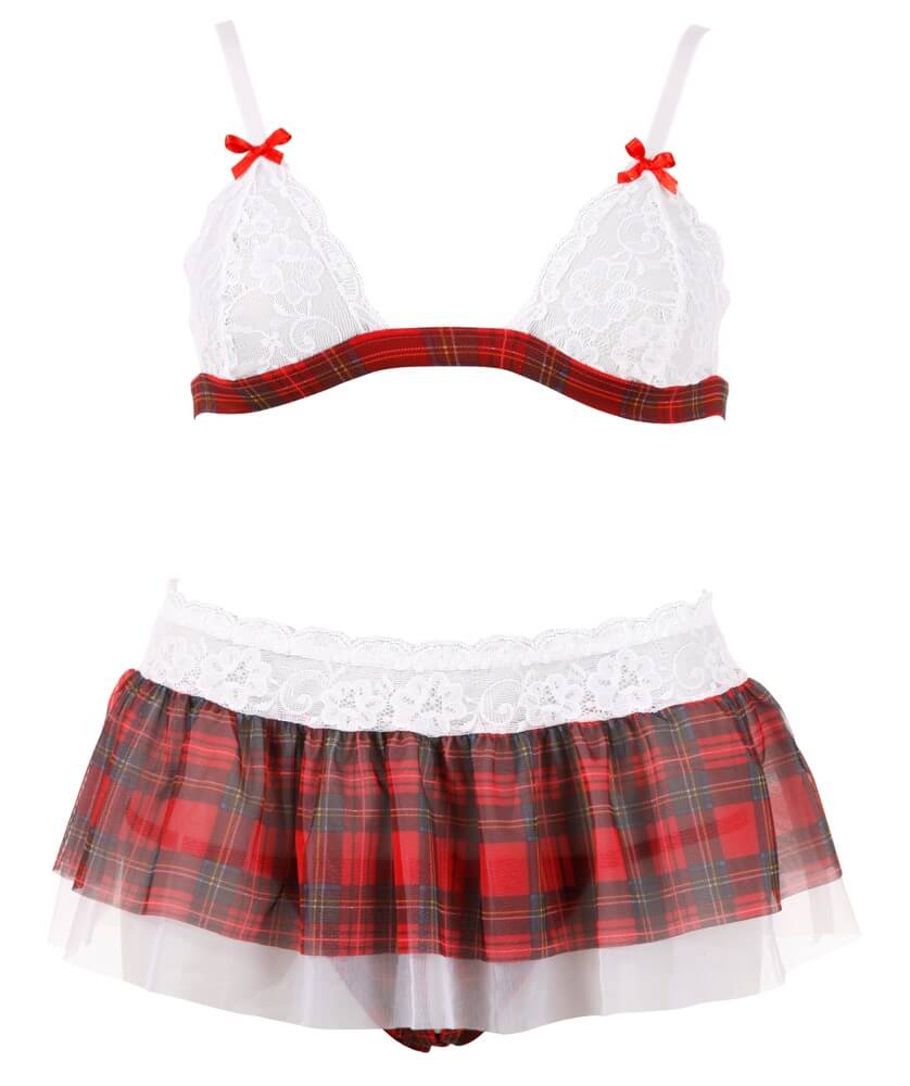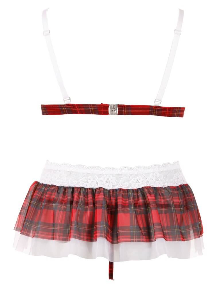Un completo vivace e ricco di dettagli, ideale per aggiungere un tocco originale alla lingerie. Il reggiseno morbido presenta coppe in pizzo bianco, spalline regolabili e pratica chiusura posteriore, mentre il bordo sotto seno in fantasia tartan richiama la minigonna coordinata.