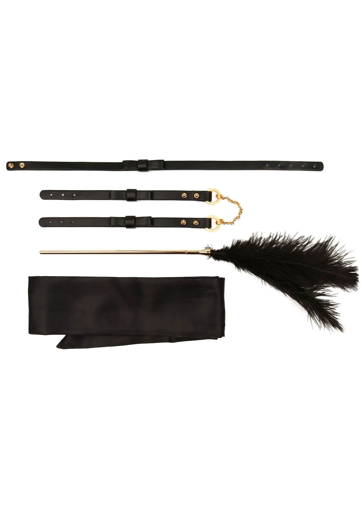 Il set include un collare coordinato, polsini per i polsi, un nastro bondage morbido e una piuma sensoriale, ideali per creare momenti di attesa, provocazione e controllo delicato. Ogni elemento è studiato per combinare comfort e impatto visivo, rendendo l’esperienza intensa ma sempre raffinata.