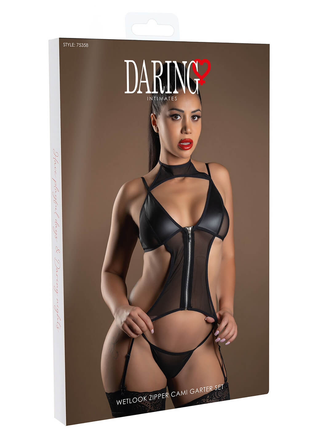 Seducente, audace, indimenticabile: il Wetlook Zipper Cami Garter Set è l’alleato perfetto per chi vuole osare e conquistare con eleganza.
